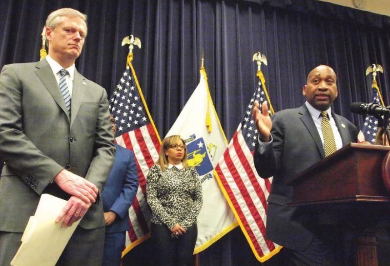 State Rep. Russell Holmes addresses reporters during a press conference on the state’s minority- and woman-owned business enterprise goals and Gov. Charlie Baker looks on.