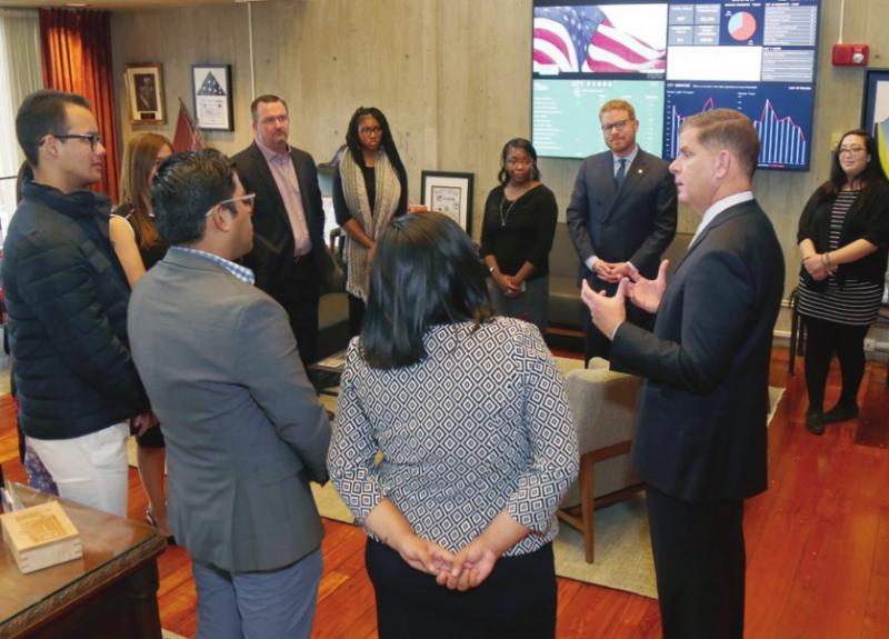 Delegates from El Salvador, Guatemala, and Honduras visit Mayor Martin Walsh at Boston City Hall.