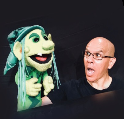 Students from the Trotter Innovation School. John McDonough of Pumpernickel Puppets with the Troll puppet from The Three Billy Goats Gruff.