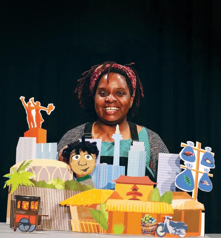 Tanya Nixon-Silberg with Pop-Up Puppet Stage and Puppet Innosanto, production designed by Sarah Nolen