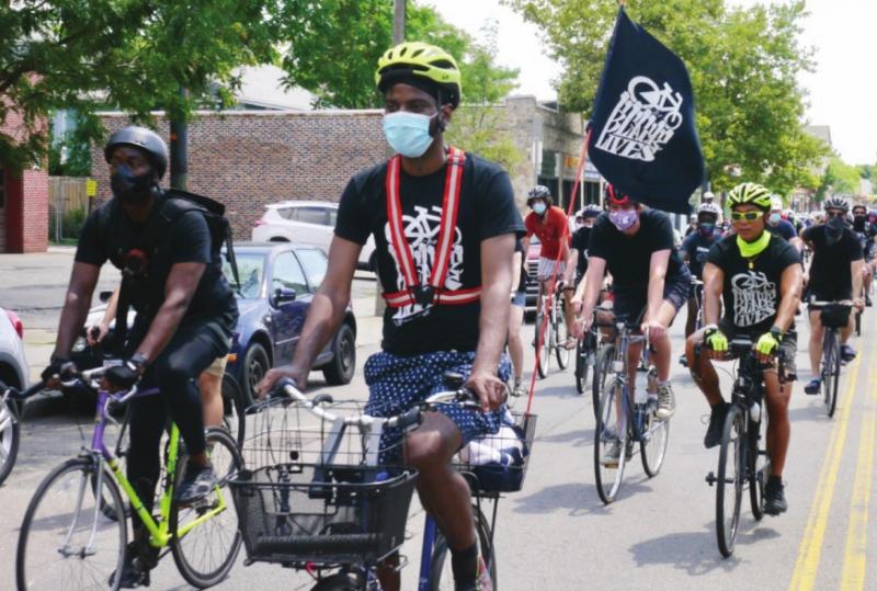 Noah Hicks leads the Ride for Black Lives on Centre Street in Jamaica Plain