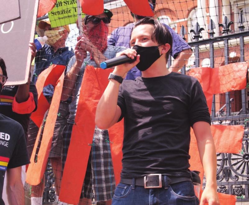 Right To The City organizer Andres Del Castillo addresses reporters at the State House.
