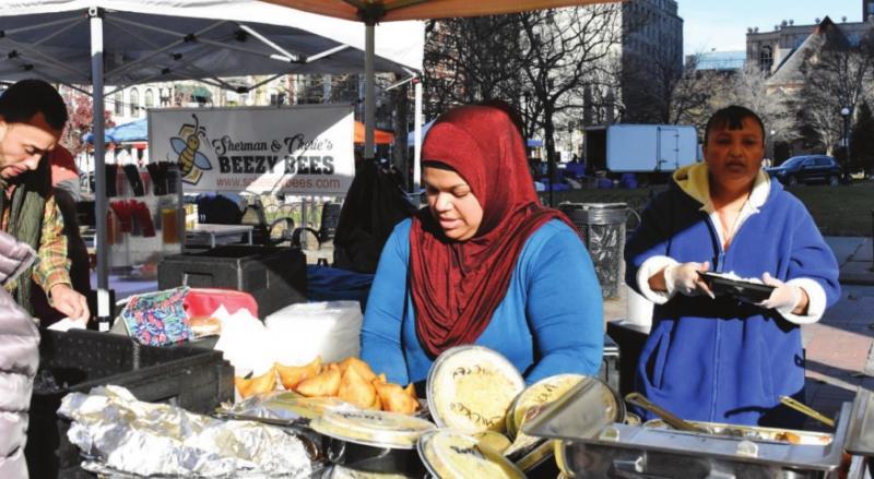 Mehzabin Mitzy Shaikh, owner of Guru the Caterer, serves hearty lunches to customers at the farmer’s market in Copley Square.
