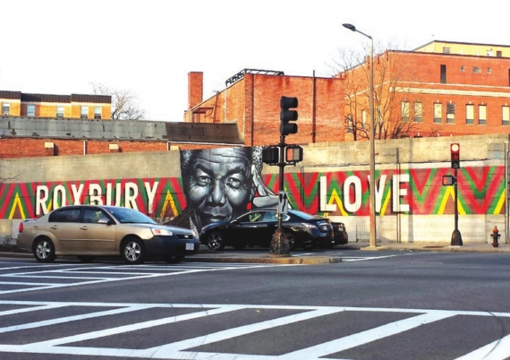Commissioned in 2014 by the City of Boston’s “Pop Up! Dudley Connections” program, the mural was only slated to be up for 18 months. Six years later, it had become an integral part of the Roxbury landscape. The 100-foot spray-painted mural featured a black-and-white portrait of Nelson Mandela in the center, smiling with his finger on his temple. The words “Roxbury Love” flanked the portrait, and a boldly colored pattern ran the full length of the wall. The mural was inspired by Mandela’s 1990 trip to Boston and launched the hashtag #RoxburyLove on social media platforms. On that trip, Mandela spoke at Roxbury’s Madison Park High School, just a mile from the site of the mural.