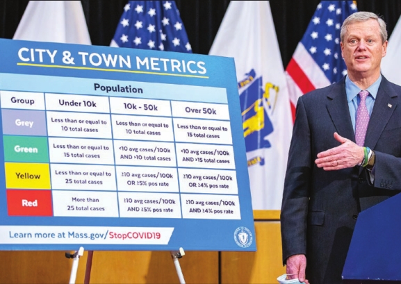 Gov. Charlie Baker outlines the state’s revised color coding system for COVID infections.