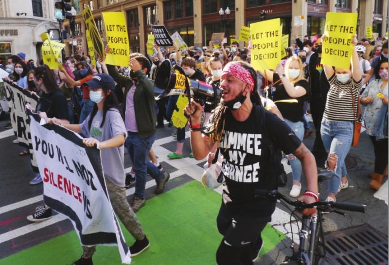 Ernst Jean Jacques, an organizer with the Freedom Fighter Coalition, leads demonstrators on Essex Street in a chant after Joe Biden and Kamala Harris were declared victors in the 2020 presidential election.