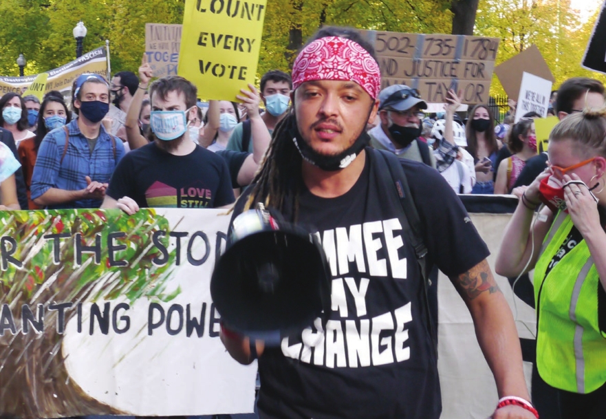 Ernst Jean-Jacques, here leading a Boston demonstration, was arrested after police said he struck a Trump supporter.