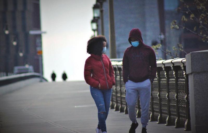 A couple crosses a traffic-free Longfellow Bridge in May during the statewide stay-at-home order.