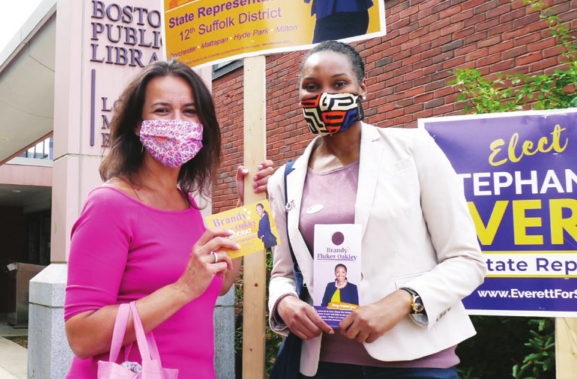 City Councilor Annissa Essaibi George and state Rep.-Elect Brandy Flucker-Oakley greet voters at the Lower Mills Branch of the Boston Public Library during the Sept. 1 primary.