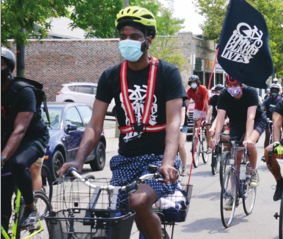 Cyclists with the Ride for Black Lives make their way down Centre Street in Jamaica Plain during a July ride.