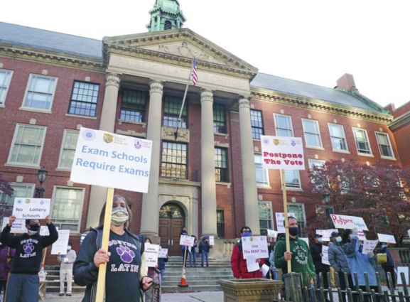 Parents at Boston Latin School demonstrate against a proposed one-year change in the admissions policy for the city’s three selective admissions schools.