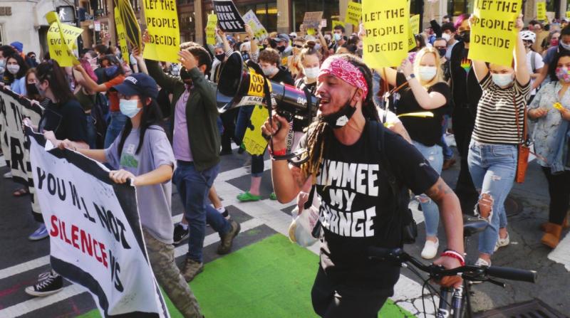 Ernst Jean-Jacques leads demonstrators in a cheer on Essex Street Nov. 7 as Joe Biden was declared president-elect.