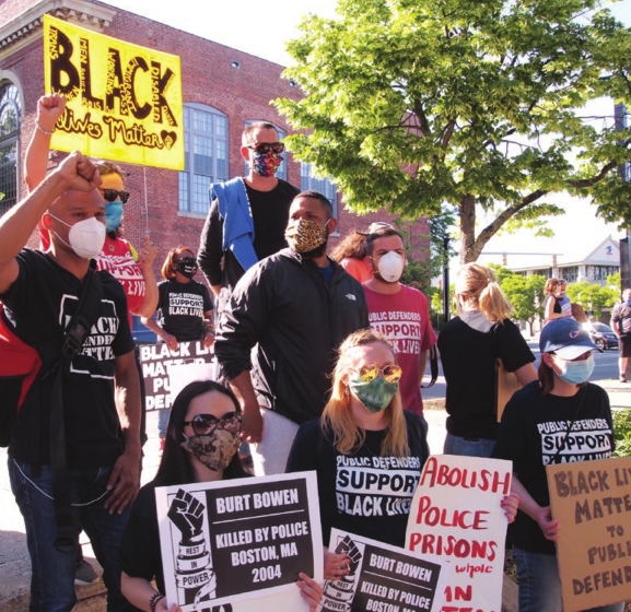 Public defenders demonstrate across from the Boston Police Area B2 substation.