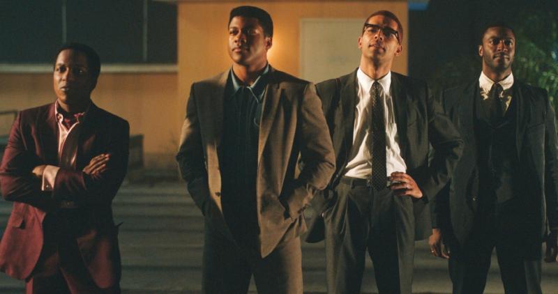 (left to right) Leslie Odom Jr. as Sam Cooke, Eli Goree as Muhammad Ali, Kingsley Ben-Adir as Malcolm X and Aldis Hodge as Jim Brown in “One Night in Miami...”.