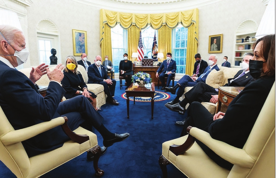 President Joe Biden and Vice President Kamala Harris meet with governors and mayors in the Oval Office of the White House Friday, Feb. 12, to discuss the American Rescue Plan. To the president’s right, New Mexico Gov. Michelle Lujan-Grisham; Detroit Mayor Mike Duggan; Maryland Gov. Larry Hogan; White House COVID-19 Response Coordinator Jeff Zients; Atlanta Mayor Keisha Lance Bottoms; Arlington, Texas Mayor Jeff Williams; Miami Mayor Francis Suarez; Arkansas Gov. Asa Hutchinson; White House Director of the National Economic Council Brian Deese; and New York Gov. Andrew Cuomo.