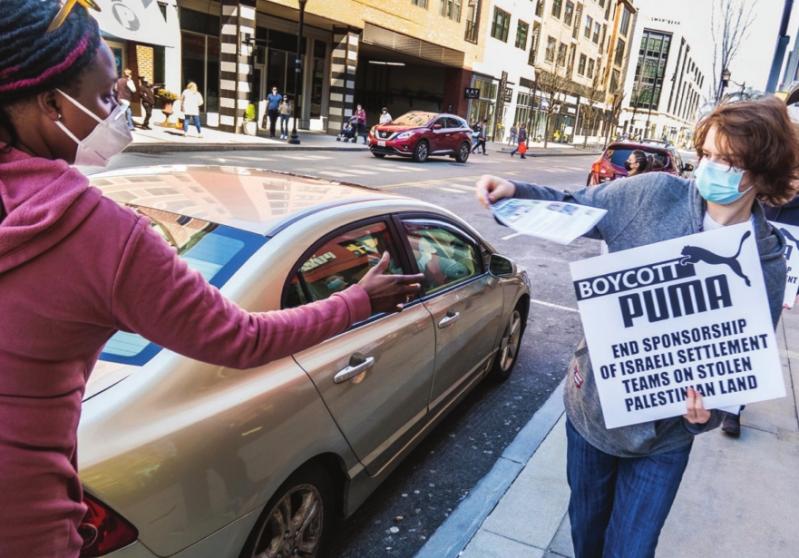 Demonstrators outside Puma’s Assembly Row storefront distribute literature about the firm’s involvement with Israeli football leagues.