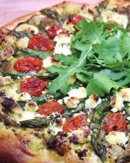 Using the back of a spoon, spread the pesto evenly on the crust. Place the asparagus spears onto the crust in a circular pattern and place the tomatoes in between the asparagus spears. Brush the remaining seasoned oil over the asparagus and tomatoes.