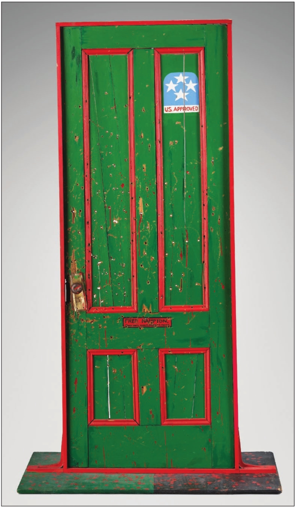 In response, Chandler created an artwork that couldn’t be stolen. The piece is crafted using a found door that’s been painted green and red, the colors of the Pan-African flag. Genuine bullet holes litter the façade, and a blueand-white star stamp in the upper right-hand corner reads “U.S. Approved.” The work represents the police barrage into Hampton’s apartment in a very tangible way and connects directly to ongoing instances of police violence.