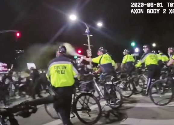 The body camera footage of Boston police violence from the aftermath of a May 31, 2020 demonstration presents a montage of shocking images: a woman with her hands up knocked to the ground by a police officer’s baton, then stepped on by advancing cops. A man, attempting to leave the scene on a scooter, knocked to the ground by an officer’s baton. Officers liberally spraying fleeing demonstrators with pepper spray.