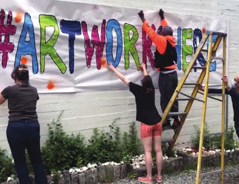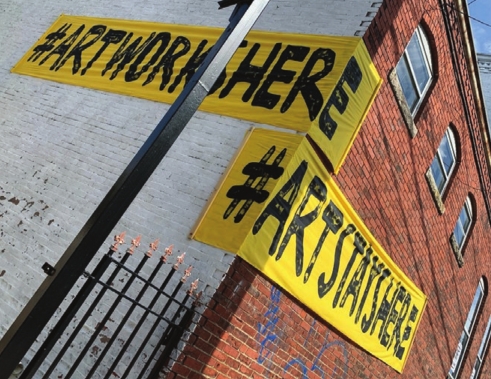 Humphreys Street Studios artists hang banners to spread the word about their #ARTWORKSHERE, #ARTSTAYSHERE campaign to turn their studio buildings into an artist-run nonprofit and affordable housing for Uphams Corner in Dorchester.