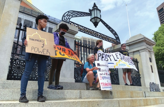Despite sweltering heat, a small crowd of roughly 50 activists and elected officials gathered on the steps of the Massachusetts State House Sunday afternoon to rally for transparency in legislation.