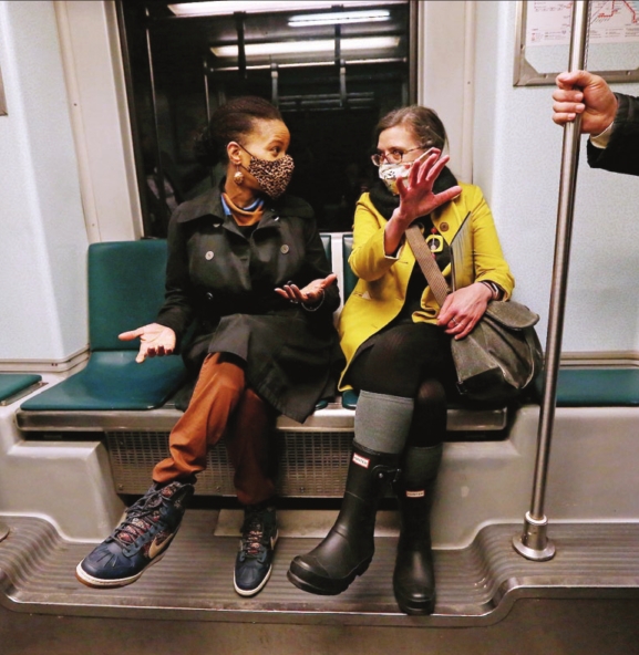 Janey, left, talks with Boston Chief of Policy Mary Churchill as they take the MBTA Green Line back to City Hall following a news conference on March 29.