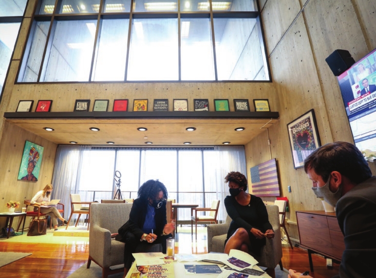 Acting Boston Mayor Kim Janey works with Chief of Staff Stephanie Garrett-Stearns and Chief of Staff Chris Osgood in the Mayor’s Office at Boston City Hall on June 25.