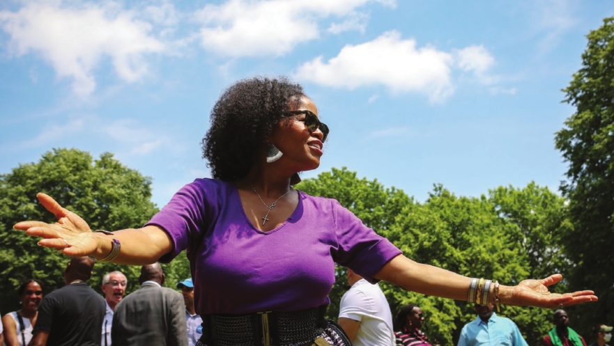 Janey dances during a Juneteenth celebration at the Martini Shell Park in the Hyde Park neighborhood of Boston on June 19.