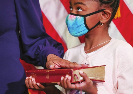 Acting Boston Mayor Kim Janey places her hand on her grandfather’s Bible, held by her granddaughter, Rosie Janey, 6, as she is sworn-in at Boston City Hall on March 24.