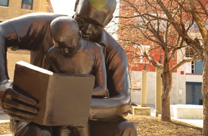 “Father and Child Reading” features a seated man holding a book. In his arms is a young child also looking at the book as the duo reads together. The seven-foot-tall sculpture is a well-known landmark on campus for students and community members alike.