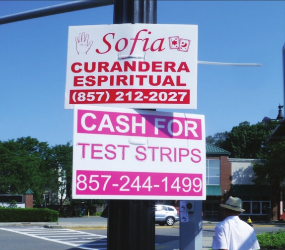 “I’ve never seen anything in West Roxbury; I’ve never seen anything in Wellesley; I’ve never seen anything in Beacon Hill, you know, a private company putting up a sign saying, ‘We buy ugly homes’ or ‘We buy test strips’ or ‘We buy formula,’” Elisa said. “Not that it’s not there, but you know, traveling, driving, riding the T and the buses throughout the city, I know distinctly, based on what’s on the public utility poles when I’ve traveled outside of low-income and working-class community to the … higher-income community.”