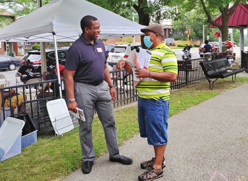 Palm cards in hand, at-large Council Candidate Dave Halbert chats with a voter during the Garrison Trotter Neighborhood Association’s Community Day observance in Laviscount Park.