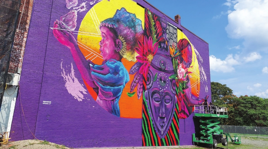 Artists work on a mural on a Washington Street building as part of the Nubian Square Public Art Initiative. The initiative, spearheaded by Black Market Nubian, is funding a series of murals and public art installations in and around the commercial district.