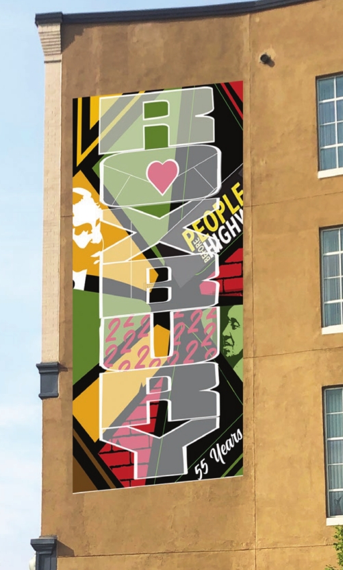 Currently located at 9 Williams Street at the corner of Williams and Washington Streets, the mural uses the colors of the MPDC logo, green, black, red and yellow, as its base. Overlaid on those geometric shapes and colors is the word “Roxbury” in large transparent white letters. The ‘o’ in the word is in the shape of an envelope with a heart seal, underscoring the love letter concept. In the background viewers can spot portraits of MPDC founders such as Ralph Smith and C. Vincent Haynes.