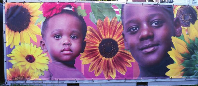 Two smaller murals are mounted on large storage containers. One 13-by-60-foot mural is mounted on the brick wall of an adjacent laundromat. On one mural, a trail of sunflower seeds moves across the faces of local children and elders. Others feature similar mixes of sunflowers and faces.