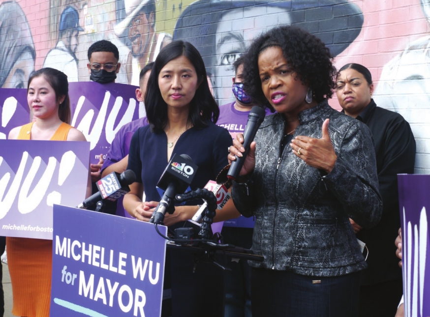 Acting Mayor Kim Janey announces her endorsement of mayoral candidate Michelle Wu in Nubian Square.