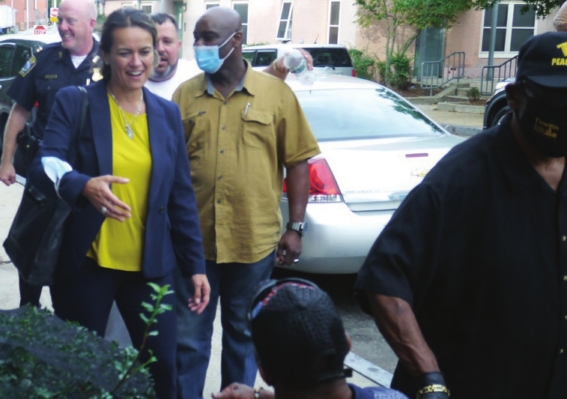 At-large Councilor Annissa Essaibi George chats with Roxbury residents in the Orchard Gardens housing development during a walk-through of the area in September.