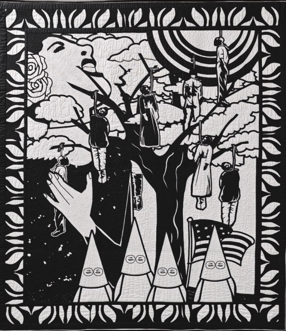 In “Strange Fruit” (2020), a starkly elegant composition in black and white, Carolyn L. Mazloomi, 71, founder of the Women of Color Quilters Network, combines KKK hoods, lynchings and a profile of Billie Holiday. Its title is from the 1937 song by Abel Meeropol, which Holiday sang as the finale to every concert.