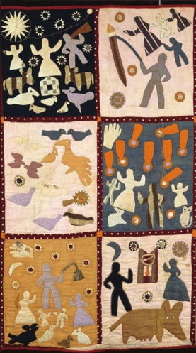 Spanning an entire wall are the two extant quilts made by Harriet Powers (1837–1910), a former slave who launched the African American story quilt tradition. Her scenes from Bible stories dance with life.