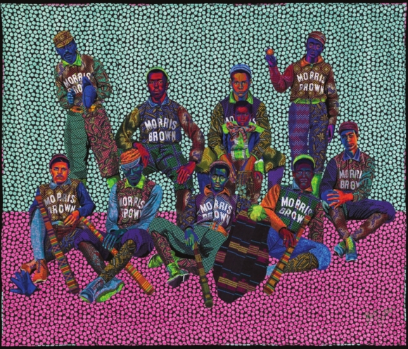 Using the jewel tones of an African palette and African fabrics such as handwoven kente cloth and Nigerian hand-dyed batiks, Bisa Butler, 48, recasts an 1899 photo of the baseball team of a pioneering African-American college. In Butler’s version, “To God and Truth” (2019), which takes its title from college motto, the figures are life-size and glow with individuality and self-respect.