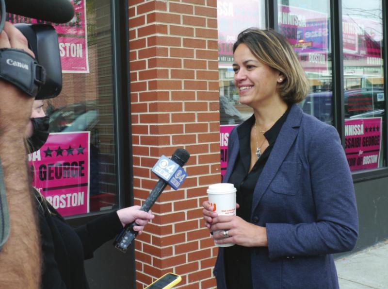 Annissa Essaibi George talks with reporters outside her Grove Hall campaign office.