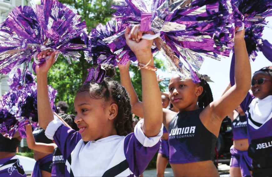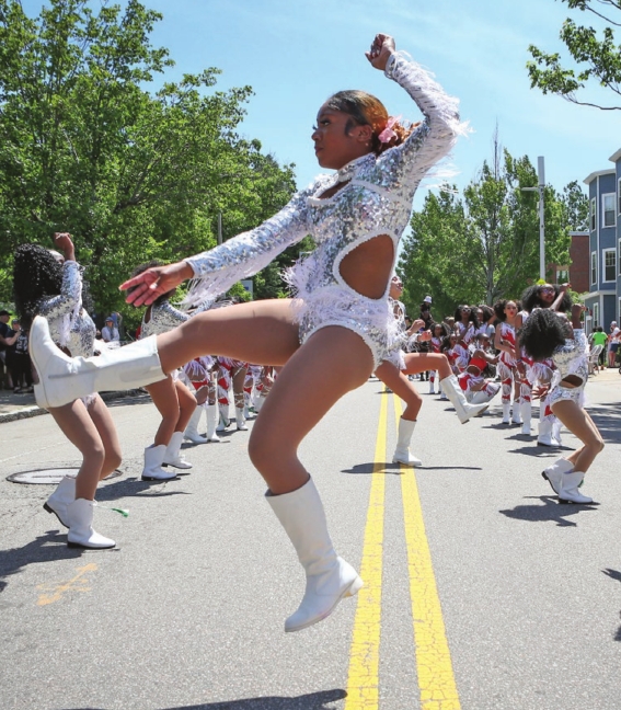 Members of Estrellas Tropicales shake their pompoms as they make their way down Dorchester Ave.
