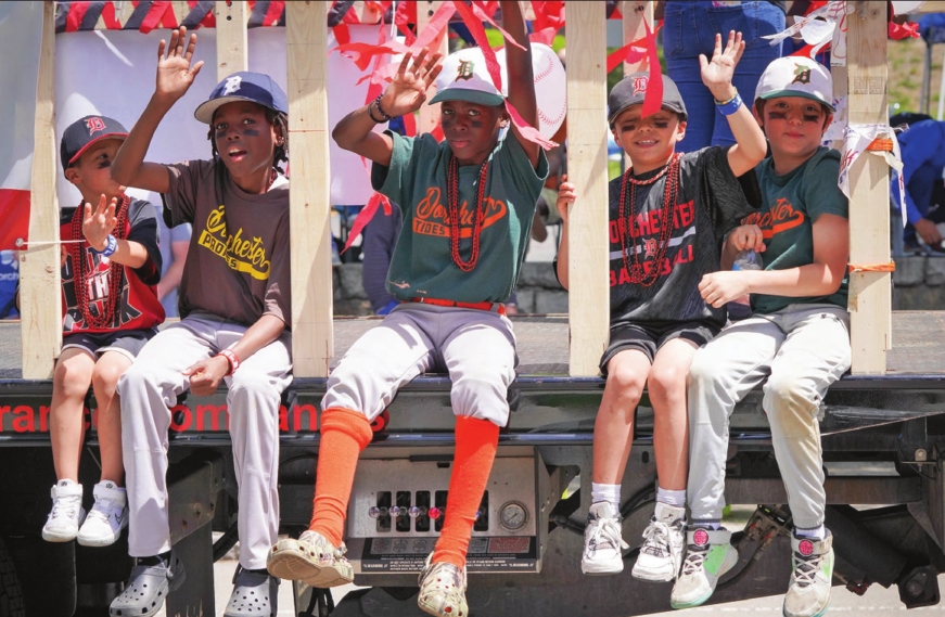 Little Miss Dorchester Ryleigh Mahoney and Young Miss Dorchester Savannah Washington wave from a convertible as they ride in the parade.