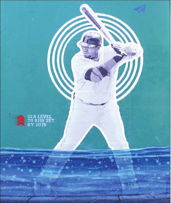 In the mural, David Ortiz’s image is directly applied on the side of Fenway Park, celebrating the ball player’s legacy and conveniently aligning with his recent induction to the Baseball Hall of Fame. But on closer inspection, viewers will notice that Ortiz’s legs are submerged in a bright blue ocean. Next to the figure, a discreet factoid notes that by the year 2070, the sea level is expected to rise two feet, making a home run a difficult task.