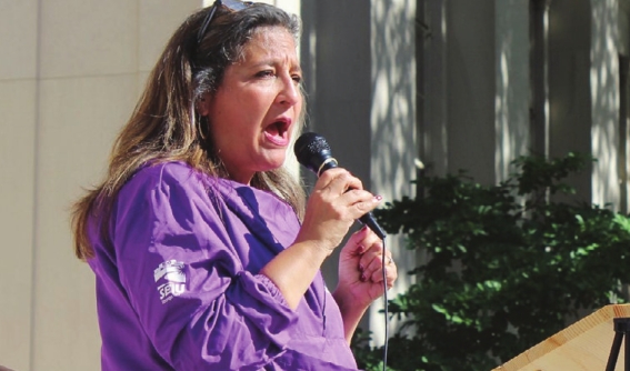 SEUI 32BJ Executive Vice Pres. Roxana Rivera speaks during a rally at MIT.