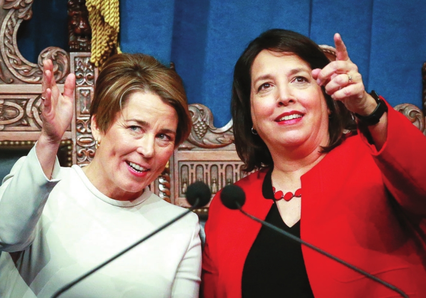 Gov. Maura Healey and Lt. Gov. Kim Driscoll wave to people in the balcony during their inauguration at the Massachusetts State House.