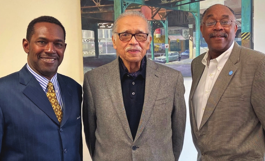 Former Banner Editor and Publisher Melvin B. Miller with new owners Ron Mitchell (left) and Andre Stark (right) at the Banner’s Dorchester office.