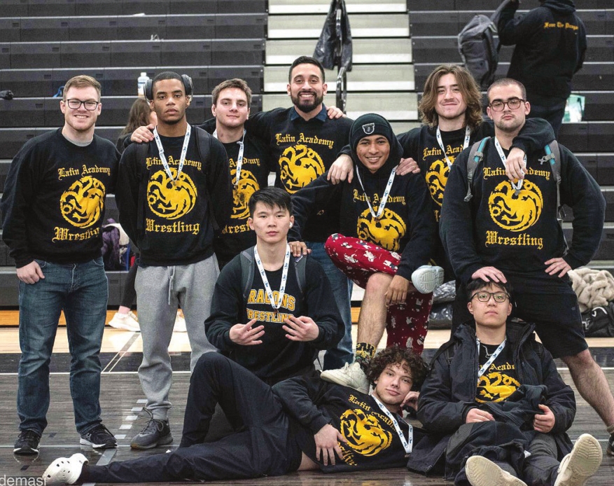 Boston Latin Academy teacher Jose Valenzuela (back, center) and members of the high school’s wrestling team.