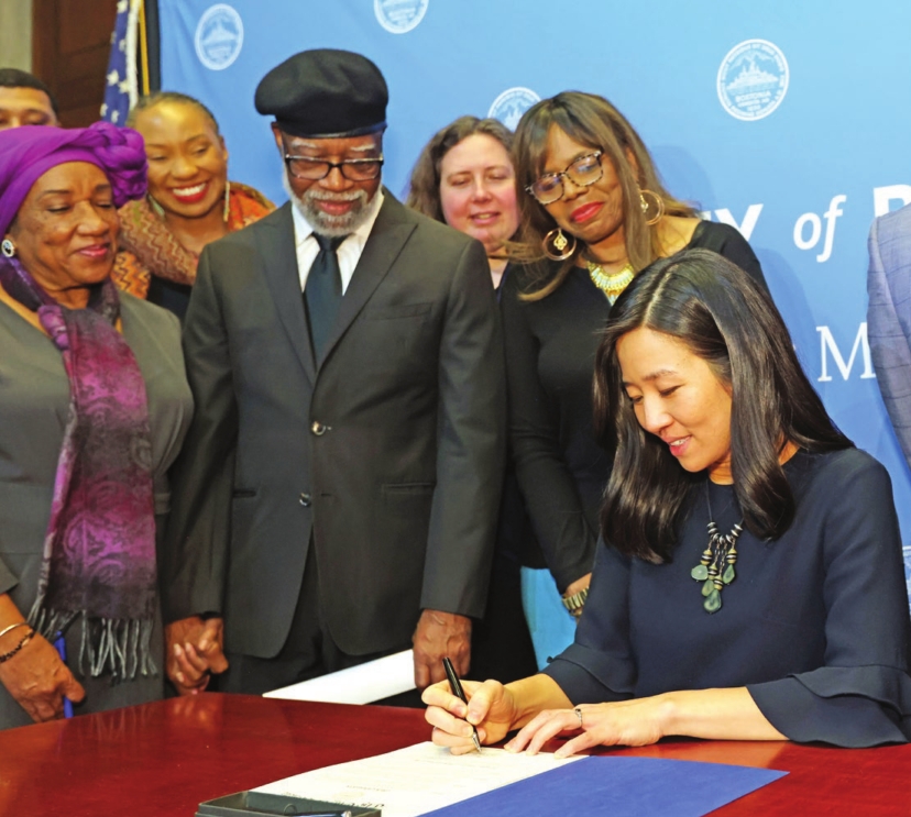 Mayor Michelle Wu signs a proclamation declaring Crispus Attucks Commemoration Day during a ceremony at City Hall.