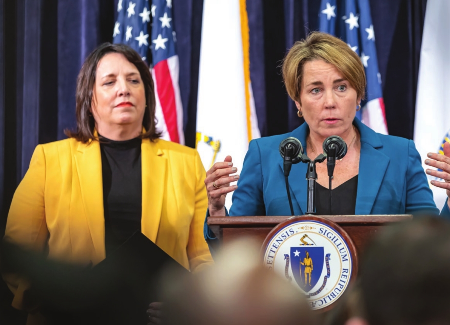 Gov. Maura Healey announces her state budget as Lt. Gov. Kim Driscoll looks on.